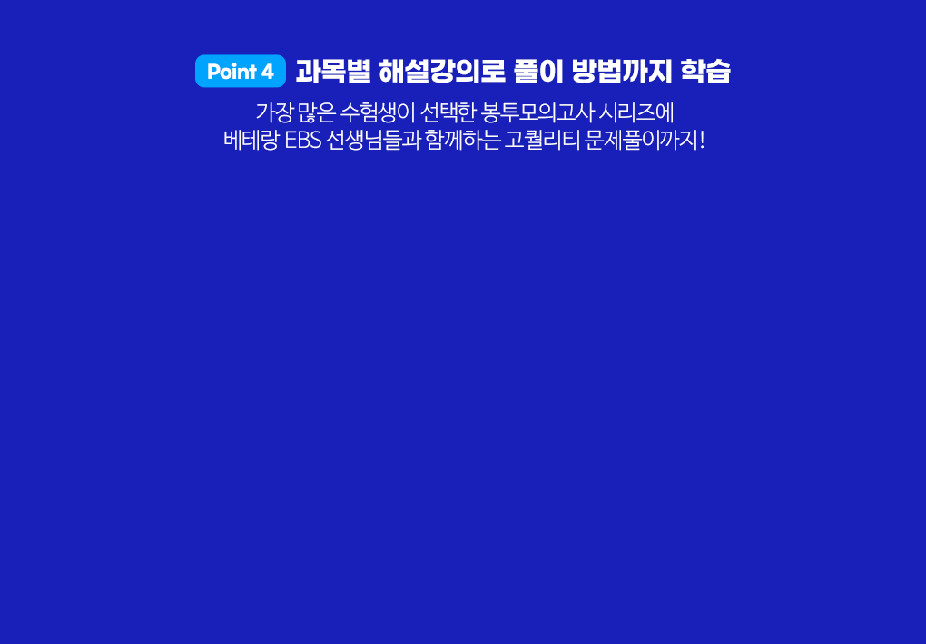 포인트4 과목별 해설강의로 풀이 방법까지 학습 가장 많은 수험생이 선택한 봉투모의고사 시리즈에 베테랑 EBS 선생님들과 함께하는 고퀄리티 문제풀이까지!