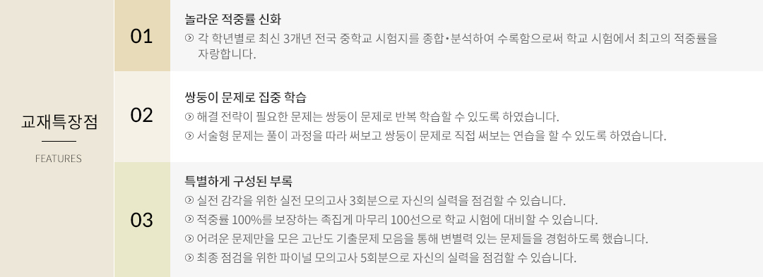 1학기 중간1학기 기말2학기 중간2학기 기말| 대분류 | Ⅰ. 실수와 그 계산 Ⅱ. 다항식의 곱셈과 인수분해 Ⅲ. 이차방정식 |