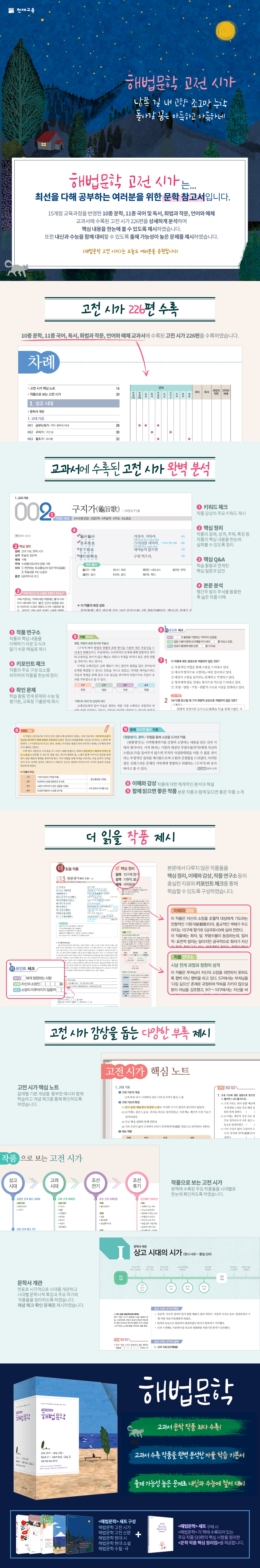 15개정 새 교육과정 10종 문학, 11종 국어 및 독서, 화법과 작문, 언어와 매체 등의 교과서에 수록된 주요 고전 시가 226편을 심도 있게 분석하여 수록했습니다.