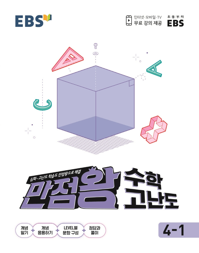 심화·고난도 학습도 만점왕으로 해결하세요. 상위권을 위한 만점왕 수학 고난도 시리즈 (초 4~6학년) 1. 확실한 개념 학습으로 워밍업 〈개념 알기〉 단원의 주요 개념을 공부하는 단계로 다양한 예와 그림을 통해 핵심 개념을 익힙니다. 〈개념 응용하기〉 개념별로 기본 원리에 따른 응용 문제를 풀면서 대표적인 응용 문제 유형을 확실히 이해합니다. 2. LEVEL별 문항 수록으로 체계적인 고난도 학습 LEVEL 1~2: 심화 문제를 풀면서 수학적 문제해결력을 높일 수 있습니다. LEVEL 3~4: 고난도 심화 문제를 풀면서 수학적 문제해결력을 높일 수 있습니다. LEVEL 종합: 다양한 수준의 심화 문제를 풀면서 수학 개념을 확실히 이해하여 창의적 사고력을 높일 수 있습니다. + ‘만점왕 수학 고난도’를 더욱 효과적으로 공부하려면? ‘만점왕 수학’으로 기본 개념을 익히고 ‘만점왕 수학 플러스’로 기초적인 응용 문제를 해결하고 난 후, ‘만점왕 수학 고난도’의 단계별 고난도 문제를 해결함으로써 수학적 문제해결력 및 창의적 사고력을 향상시킬 수 있습니다. EBS 초등사이트(primary.ebs.co.kr) 무료강의 제공