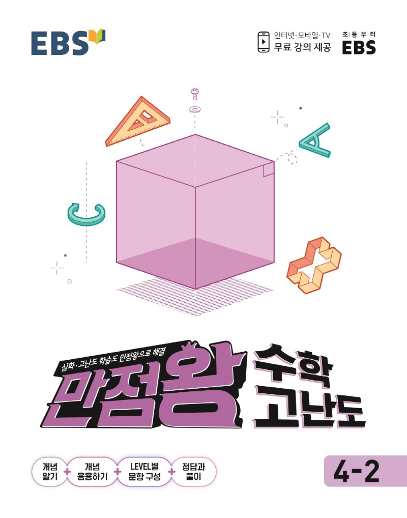 심화·고난도 학습도 만점왕으로 해결하세요. 상위권을 위한 만점왕 수학 고난도 시리즈 (초 4~6학년) 1. 확실한 개념 학습으로 워밍업 〈개념 알기〉 단원의 주요 개념을 공부하는 단계로 다양한 예와 그림을 통해 핵심 개념을 익힙니다. 〈개념 응용하기〉 개념별로 기본 원리에 따른 응용 문제를 풀면서 대표적인 응용 문제 유형을 확실히 이해합니다. 2. LEVEL별 문항 수록으로 체계적인 고난도 학습 LEVEL 1~2: 심화 문제를 풀면서 수학적 문제해결력을 높일 수 있습니다. LEVEL 3~4: 고난도 심화 문제를 풀면서 수학적 문제해결력을 높일 수 있습니다. LEVEL 종합: 다양한 수준의 심화 문제를 풀면서 수학 개념을 확실히 이해하여 창의적 사고력을 높일 수 있습니다. + ‘만점왕 수학 고난도’를 더욱 효과적으로 공부하려면? ‘만점왕 수학’으로 기본 개념을 익히고 ‘만점왕 수학 플러스’로 기초적인 응용 문제를 해결하고 난 후, ‘만점왕 수학 고난도’의 단계별 고난도 문제를 해결함으로써 수학적 문제해결력 및 창의적 사고력을 향상시킬 수 있습니다. EBS 초등사이트(primary.ebs.co.kr) 무료강의 제공